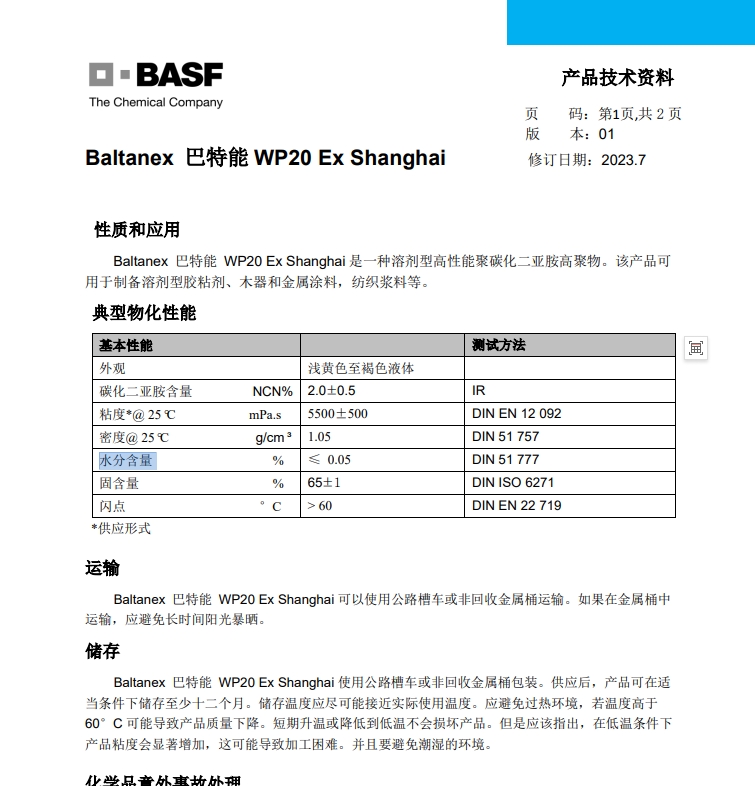 巴斯夫 WP20 Ex 制备溶剂型胶粘剂、木器和金属涂料,纺织浆料